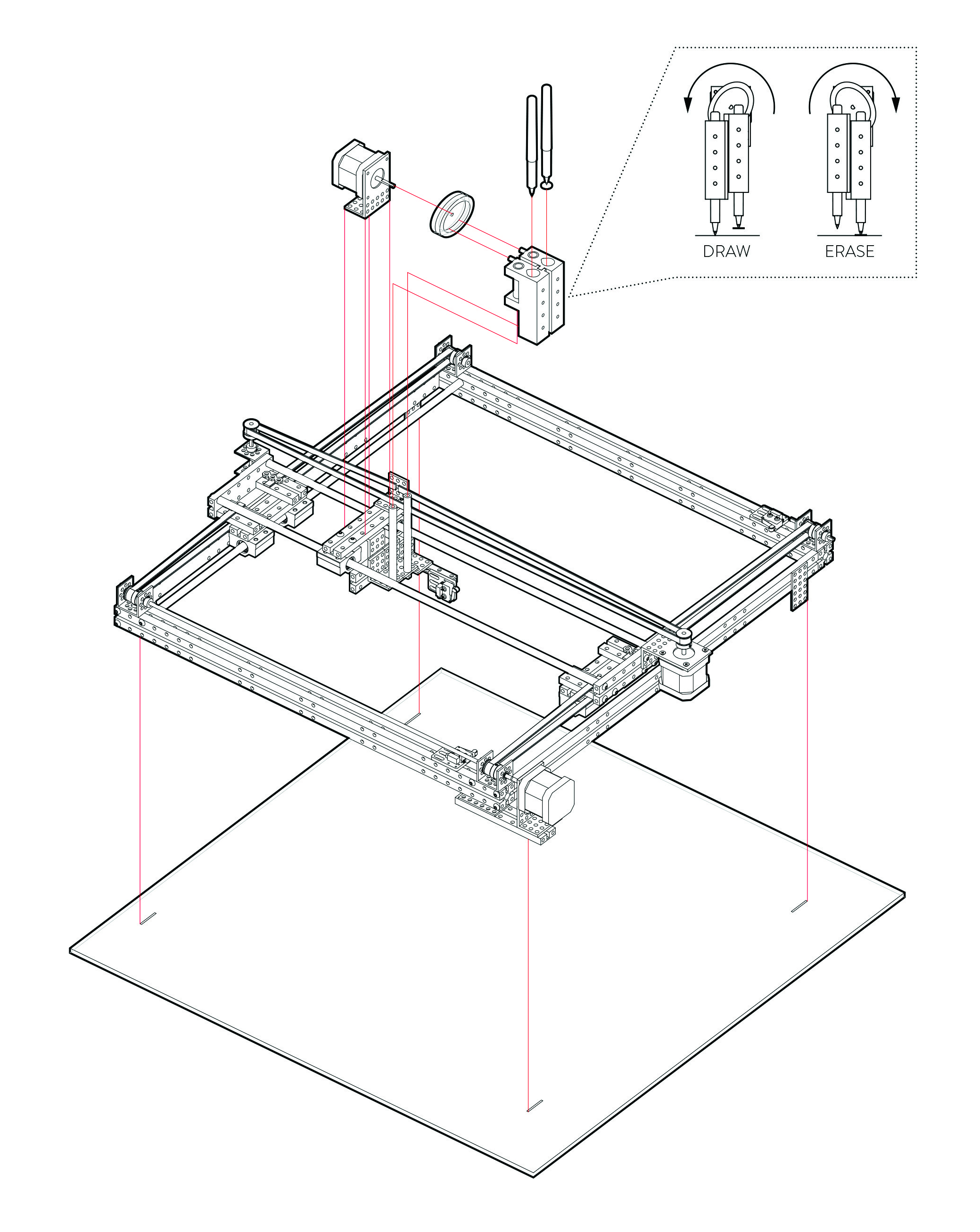 Figure 9: Exploded axonometric of drawing machine. The diagram in the upper-right corner shows how the motion of the elliptical rotor on the Z-axis allows the machine to both draw and erase.