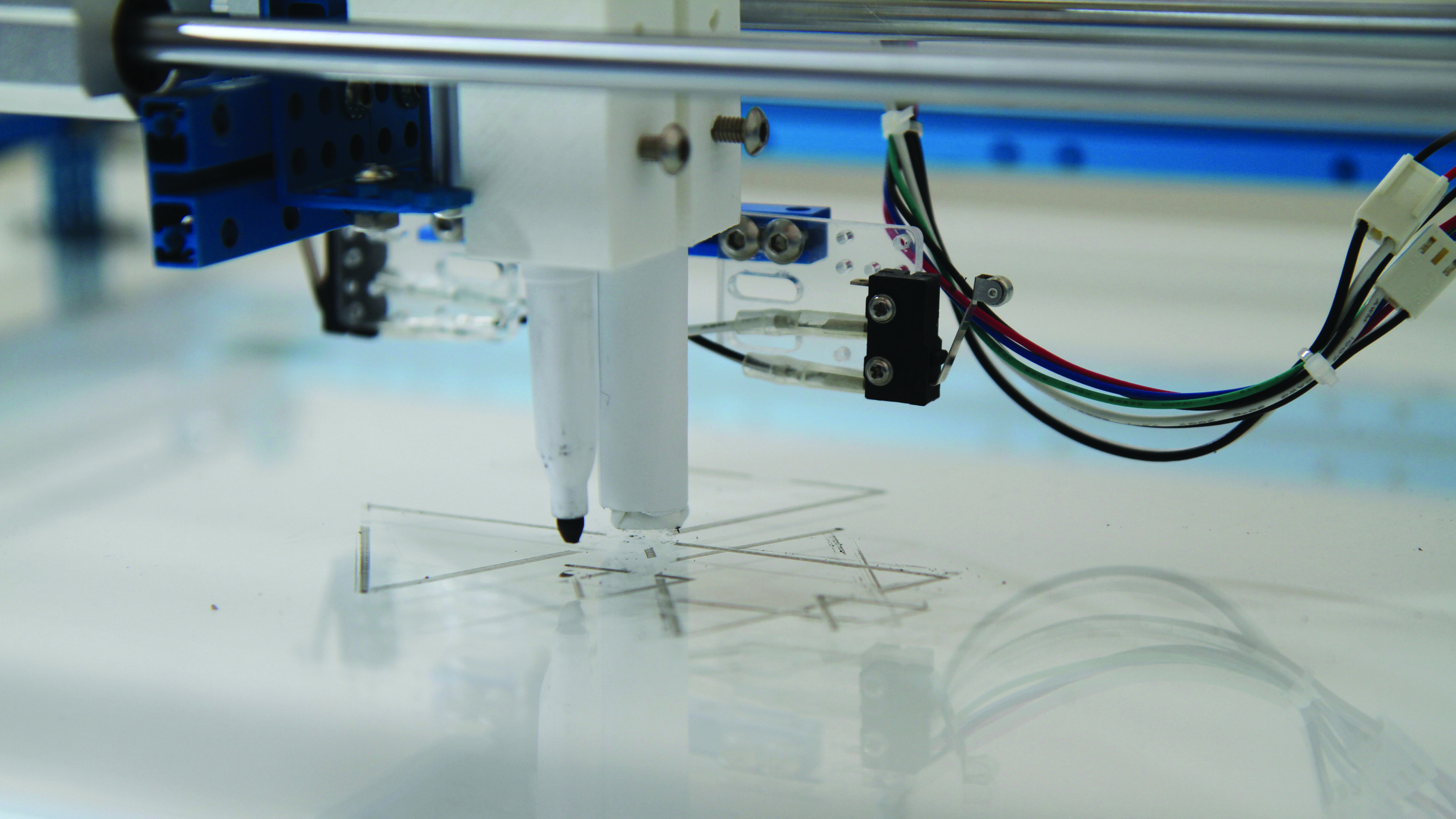 Figure 1: Detail photo of drawing machine during the process of drawing, showing dry-erase marker in the foreground and eraser in the background.