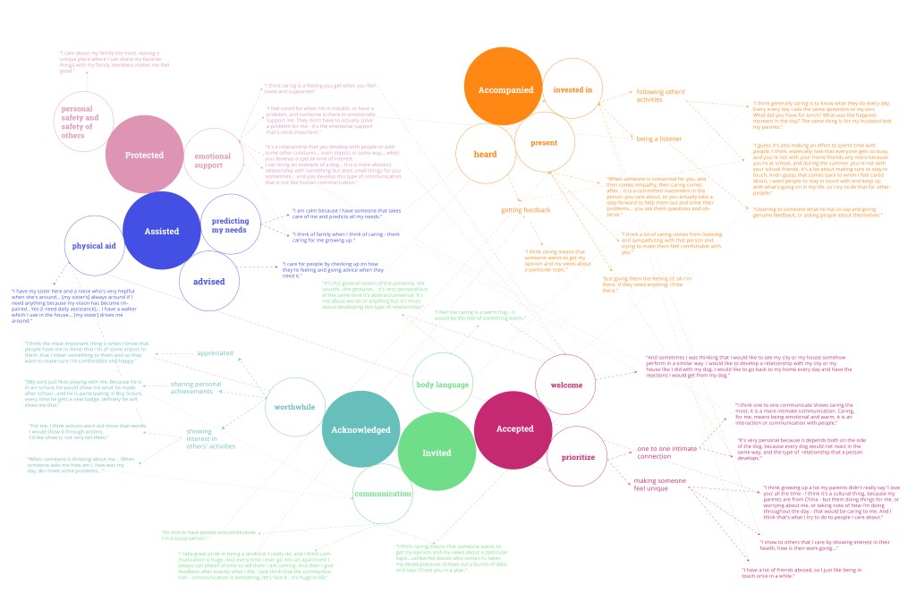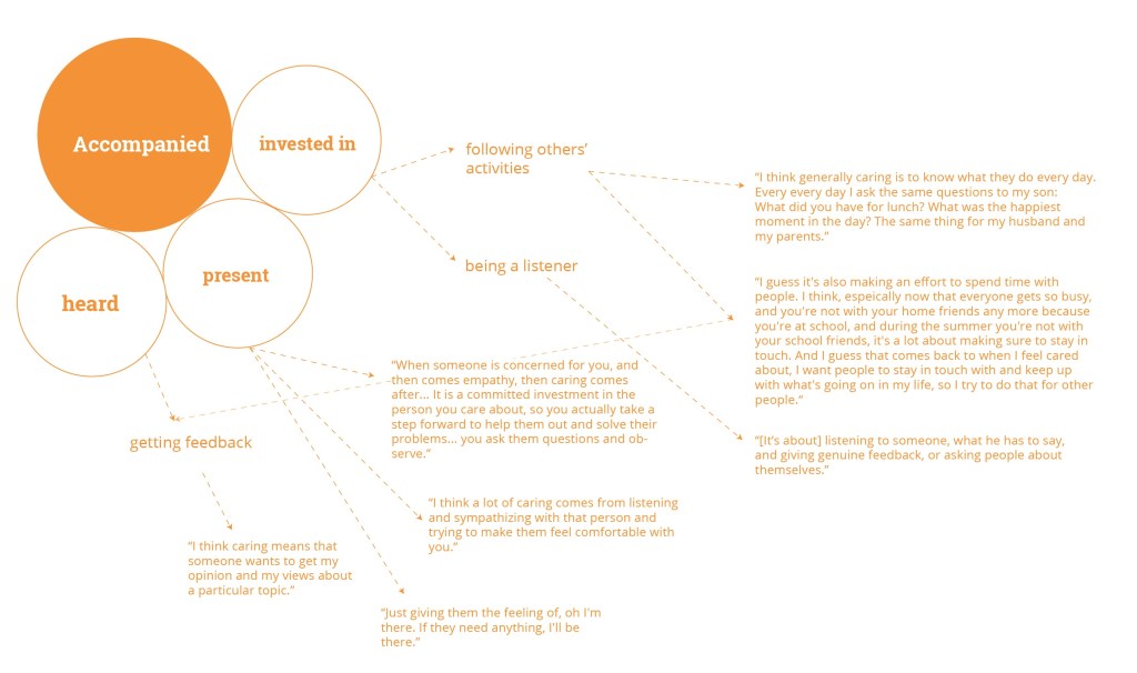 The initial phase of research involved inquiry into emerging trends in urban well-being, a review of emerging interaction technology, and most importantly, a round of primary research that dissected the term caring into various perspectives. Through this research, we devised six terms for caring: accepted, accompanied, invited, acknowledged, assisted, and protected.