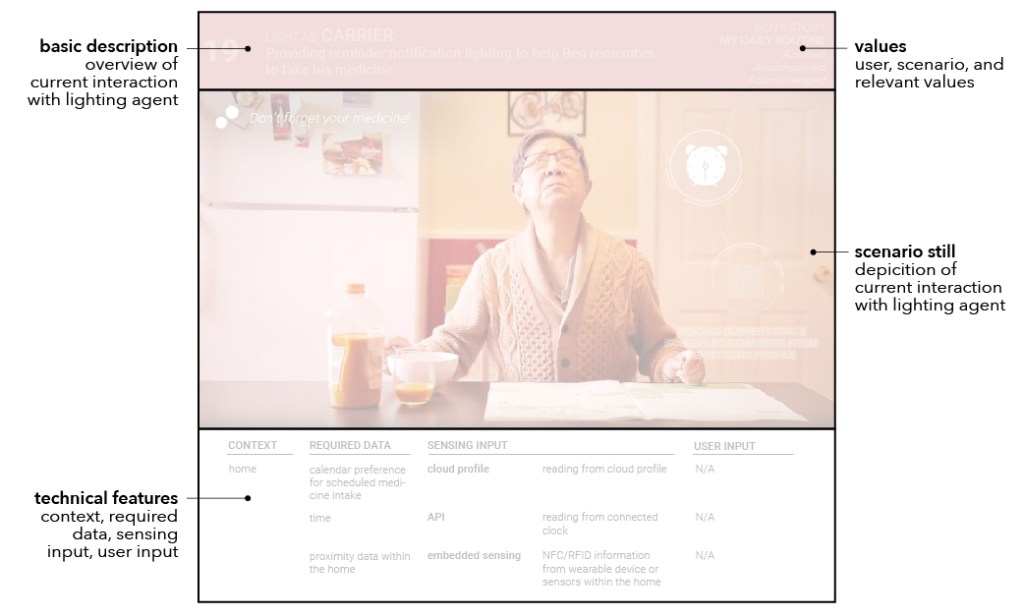 This project resulted from a collaboration with Signify (formerly Philips Lighting) and resulted in a design vision for such an AmI system, where user values act as the driver for design. Specifically, the system is modeled as a personal lighting agent, tasked with conveying a sense of personalized, contextual caring to city inhabitants.