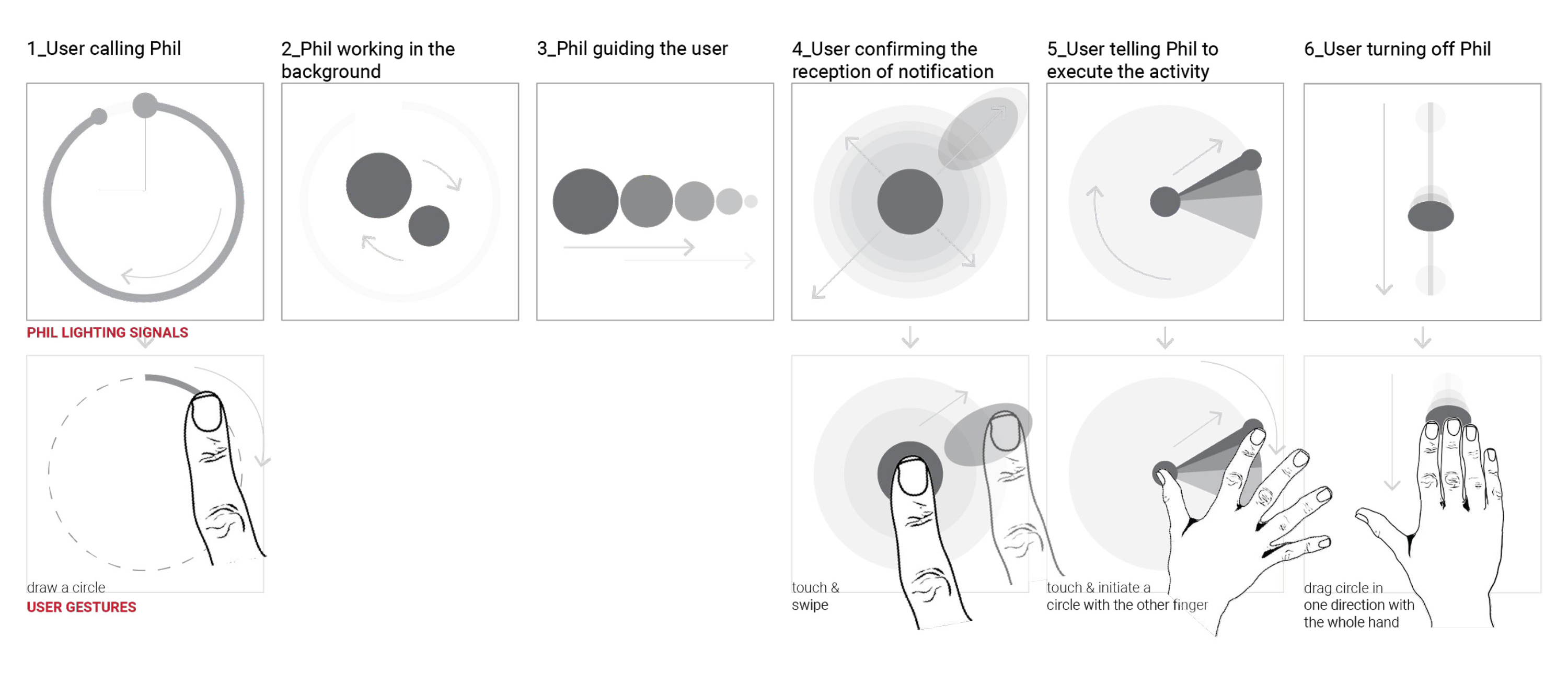 In an effort to keep Phil personal and private, voice commands were avoided, and a gestural interaction system was developed for communication.