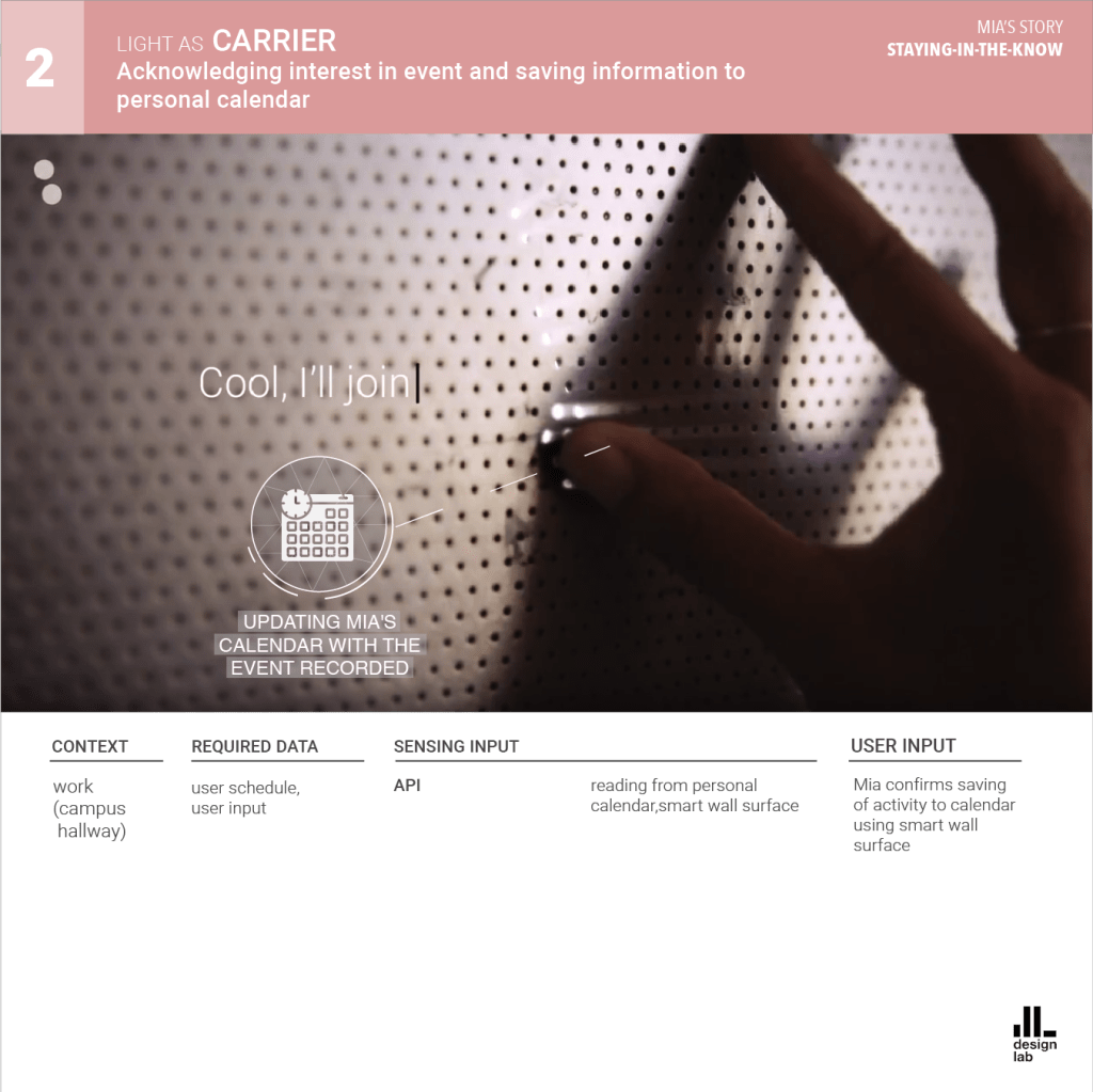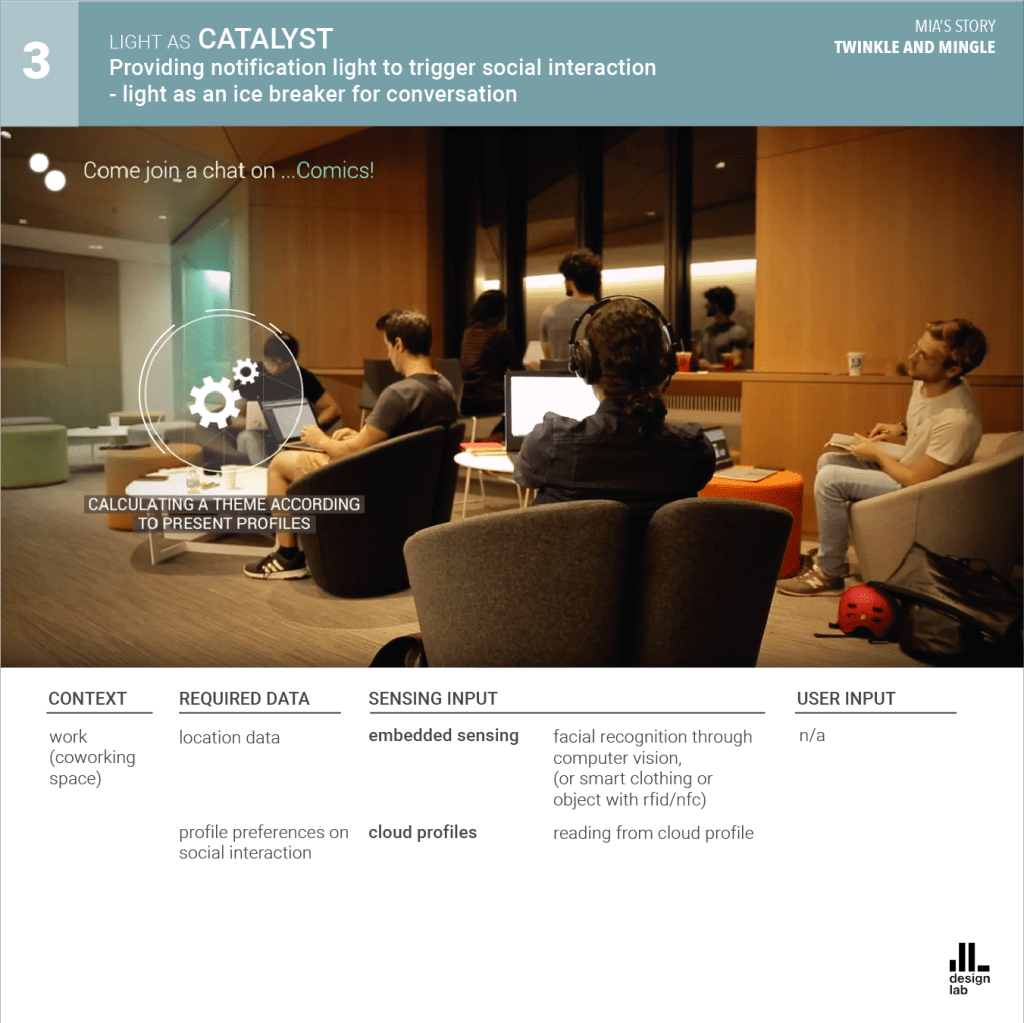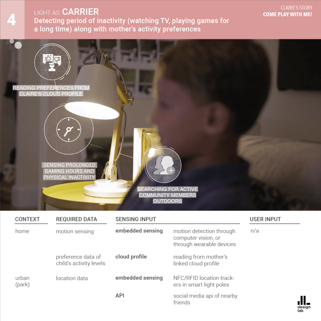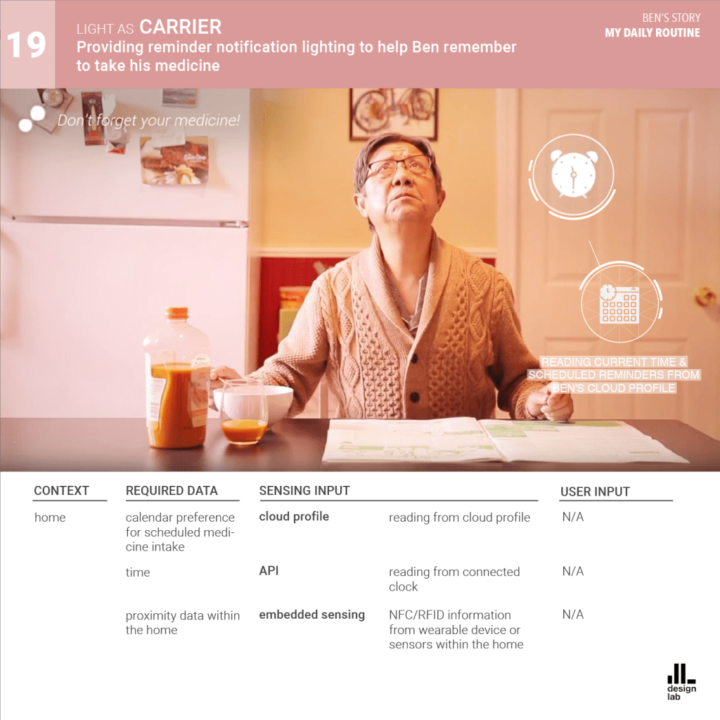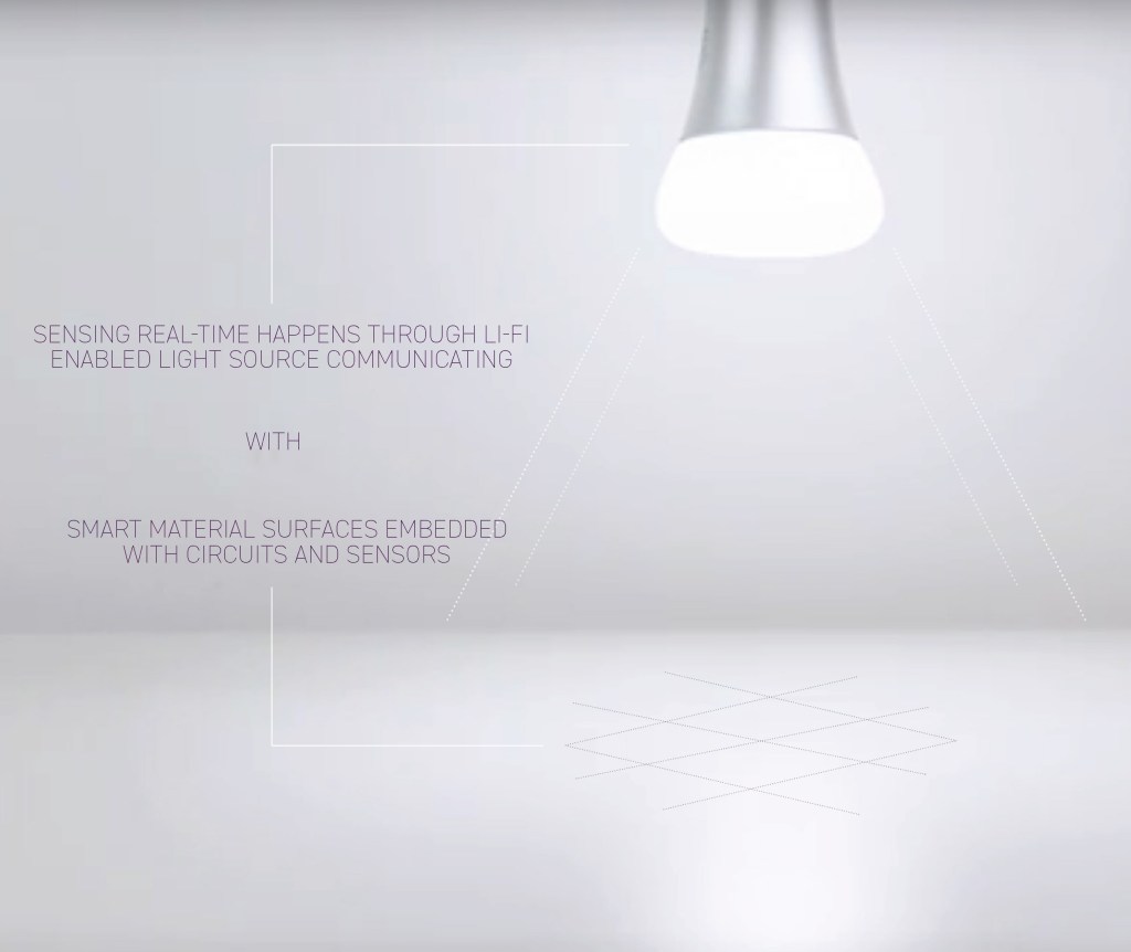 The AmI system is presented as Phil, the caring lighting agent. Phil communicates through a combination of Li-Fi technology and smart material surfaces, interacting with its users everywhere from home, to work, to public urban spaces.