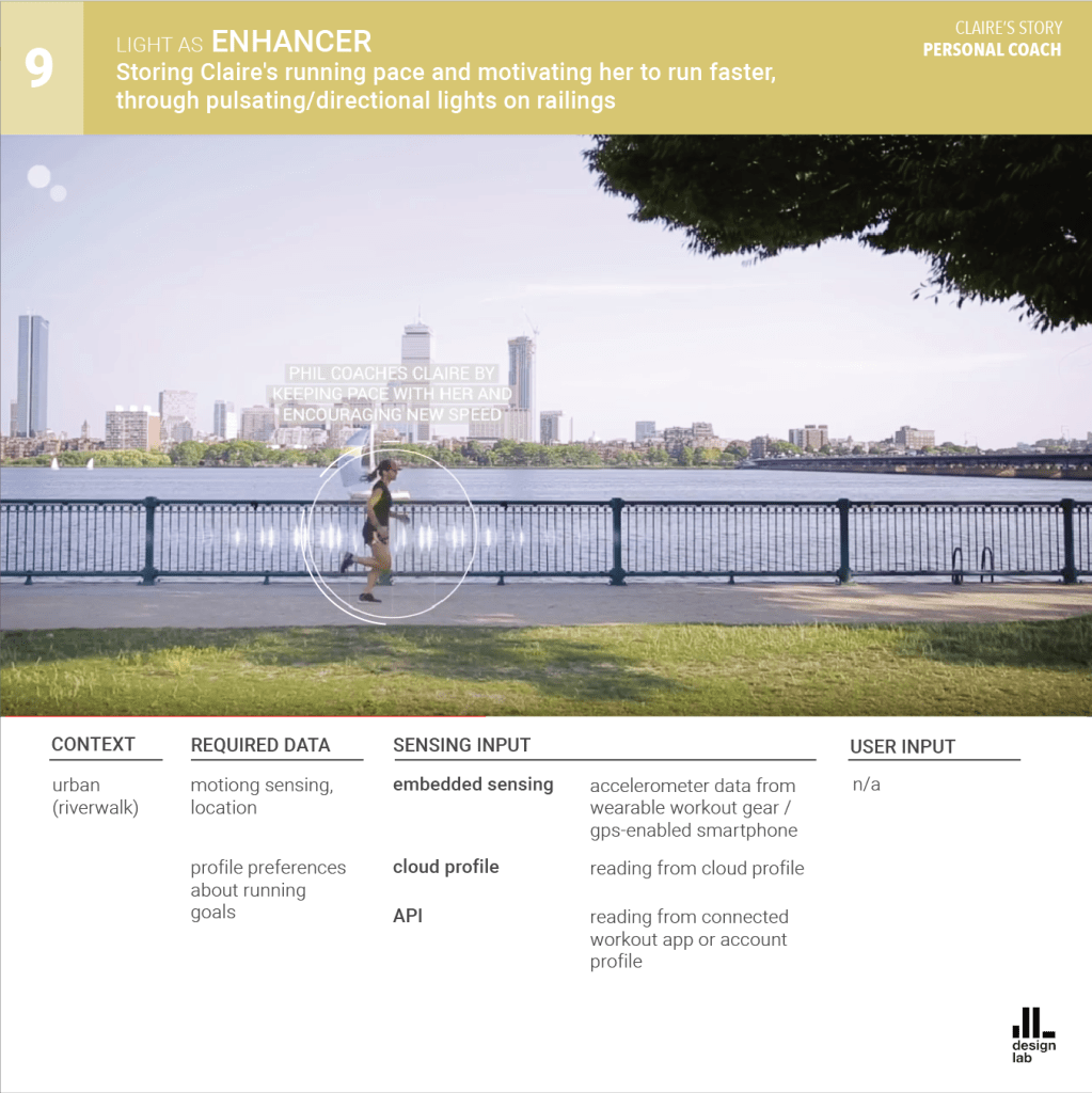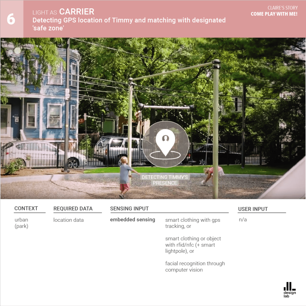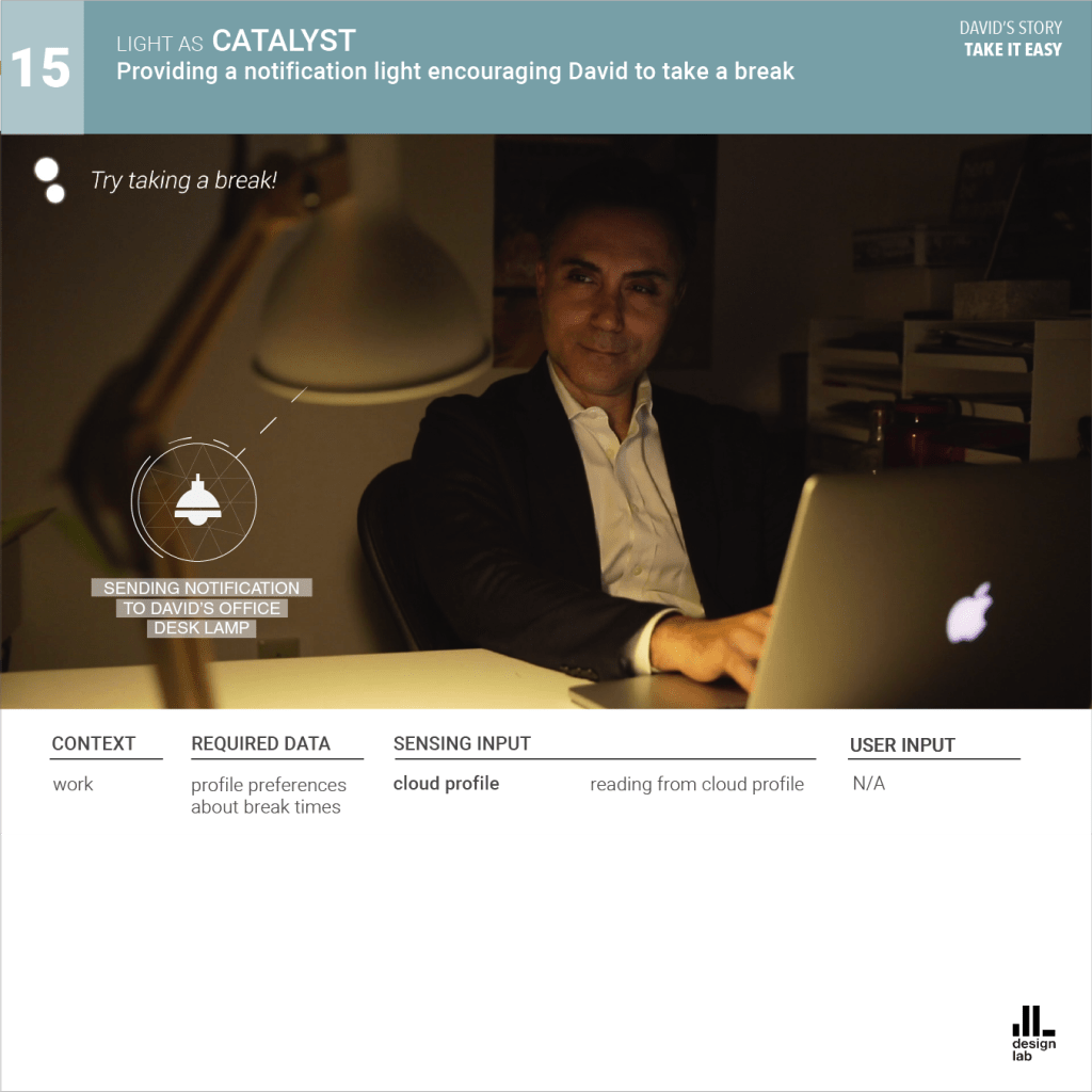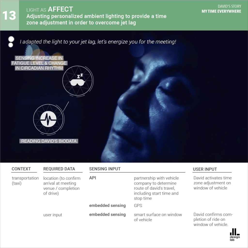 The AmI system is presented as Phil, the caring lighting agent. Phil communicates through a combination of Li-Fi technology and smart material surfaces, interacting with its users everywhere from home, to work, to public urban spaces.