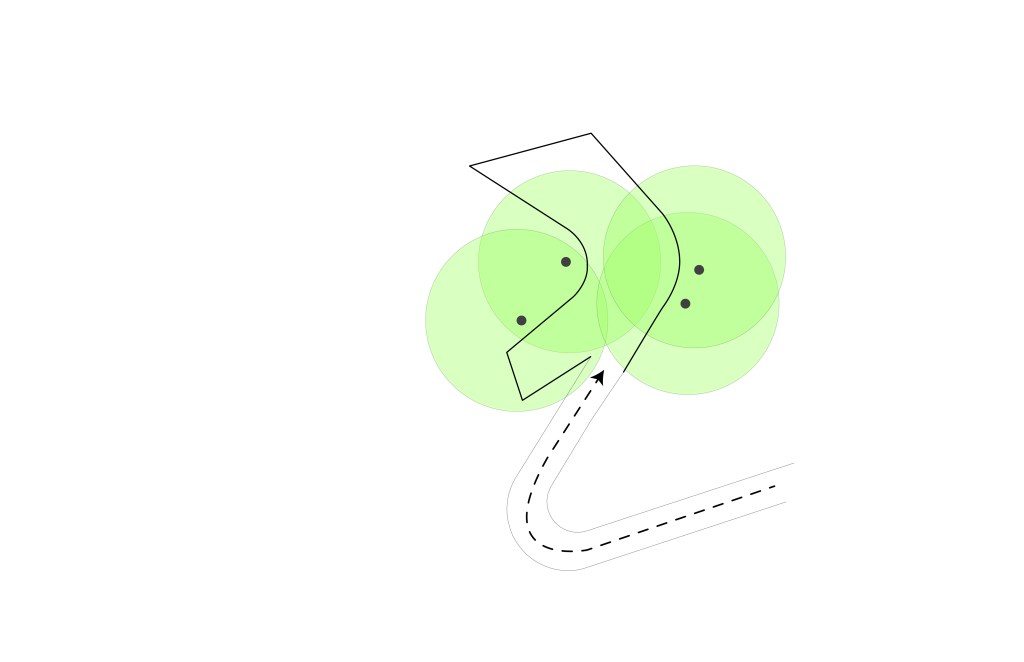 In its built form, the tree house wraps tightly around a cluster of pine and oak trees, mimicking the curving path of the existing walking bridge and orienting towards the pond in the center of the site.