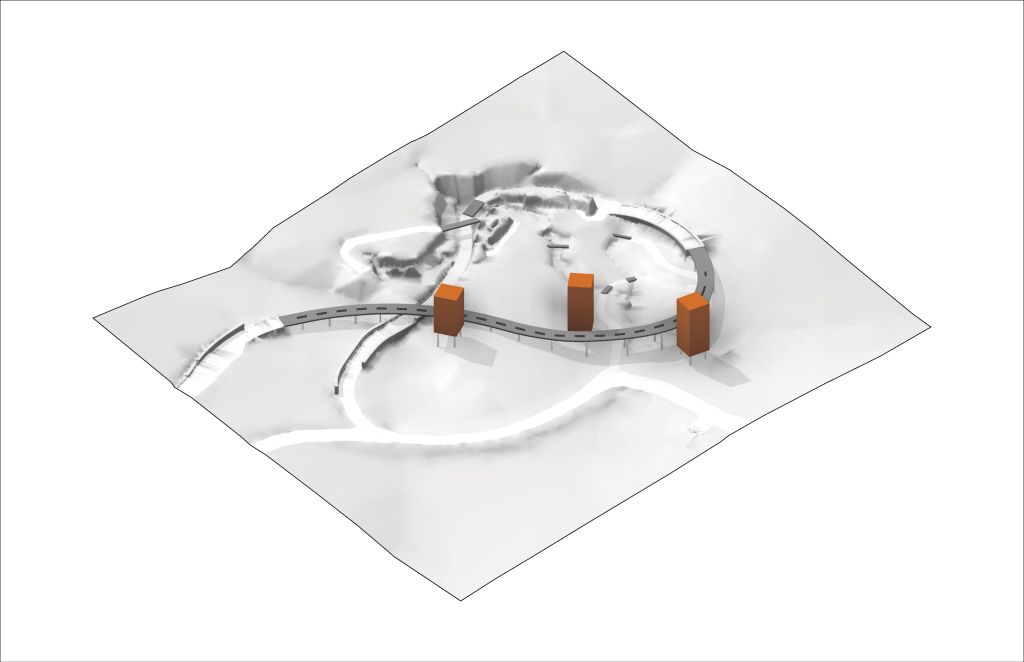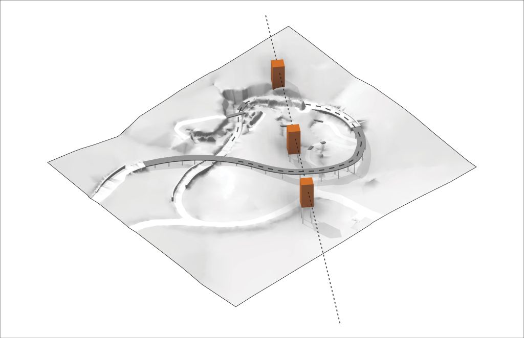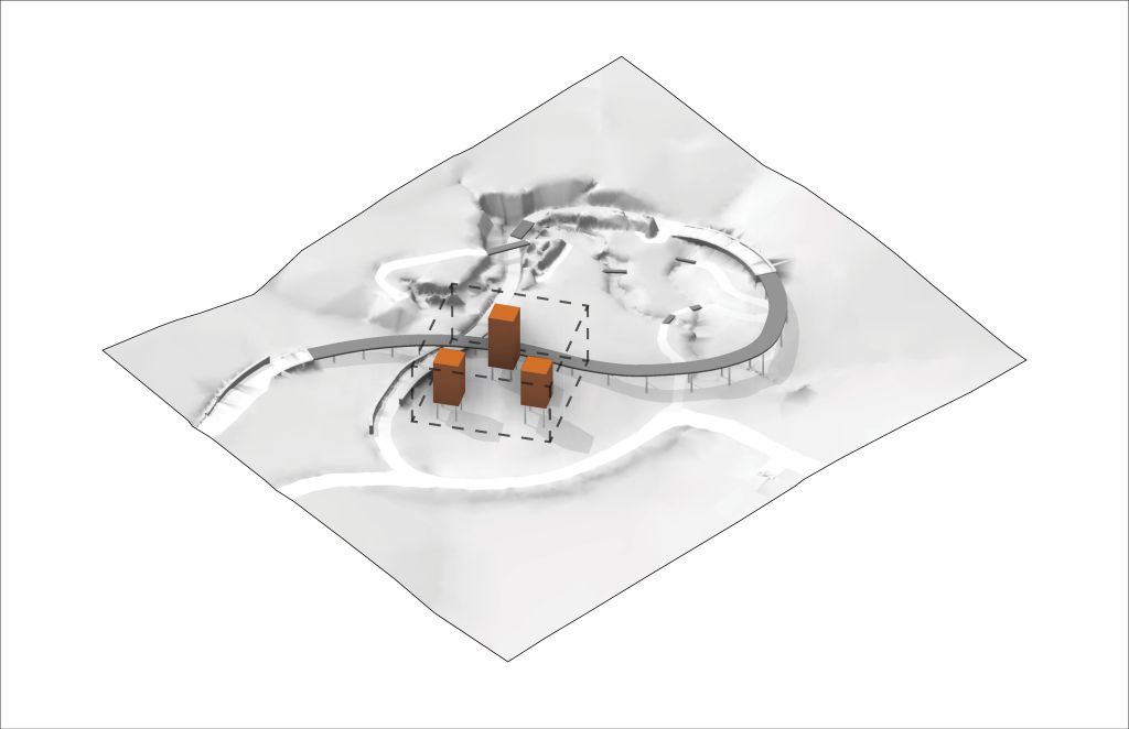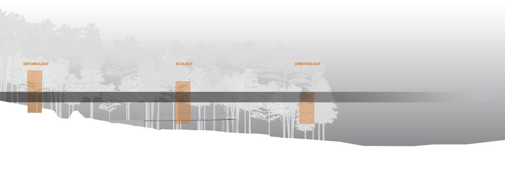 In order to make best use of the diverse and otherwise organic site, the structures are aligned on a linear axis stretching down the main hill. Their placement connects physically varied and ecologically different zones, and their alignment encourages the visitor to look beyond the garden’s boundaries to the nearby boardwalk and additional gardens.