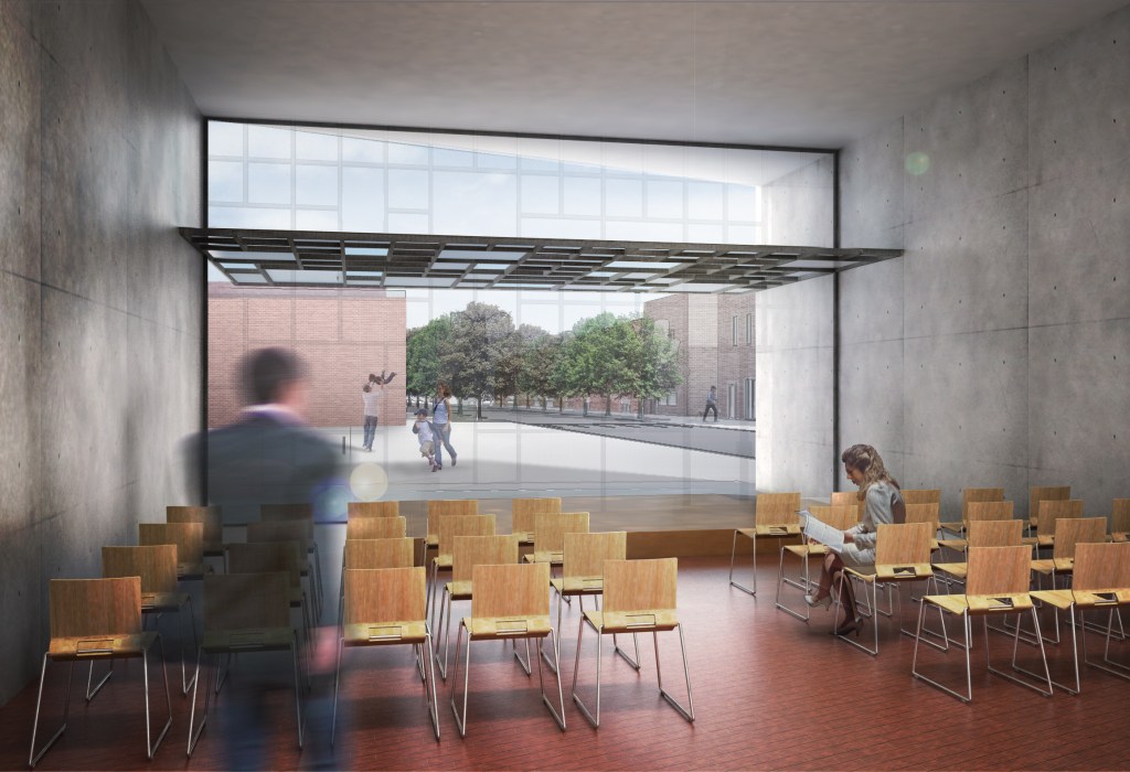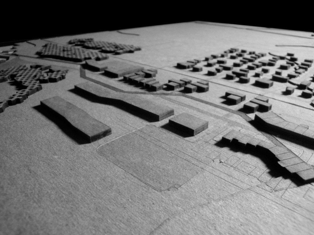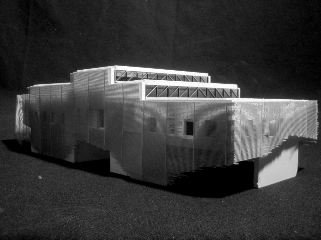 Following the master plan came the design for a municipal complex that comprised a civic center, library, and fire station. In an initial group design, concrete walls provide the strength and solidity expected of a civic building, while a computationally-designed wooden screen helps soften the image to provide a more welcoming public facade. To help convey the material quality of the design, the model was constructed using specially-constructed 1/8” plaster panels, which were cast between two thick, evenly spaced panes of glass and subsequently laser cut and etched. In addition, a computationally-designed wooden screen was laser cut out of thick paper to wrap around the model.