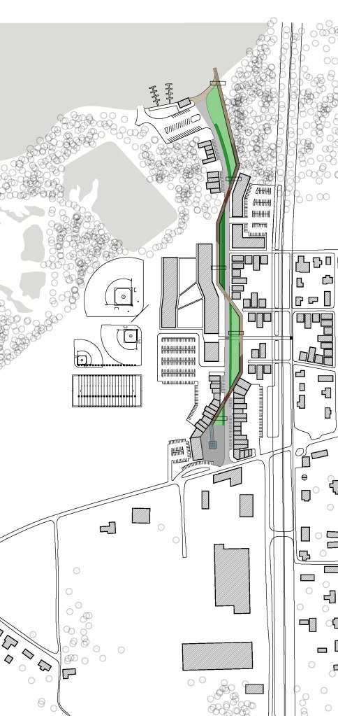 A redeveloped Smithville will connect to the waterway, the railroad, and the highway, creating a strip of social and commercial activity that will help draw immediate attention to the town and secure its ability to survive even when one resource is depleted.