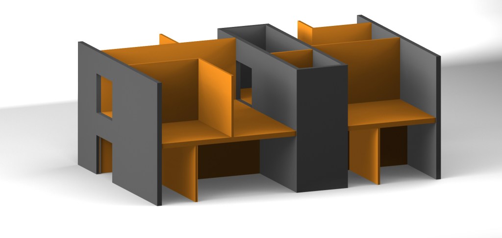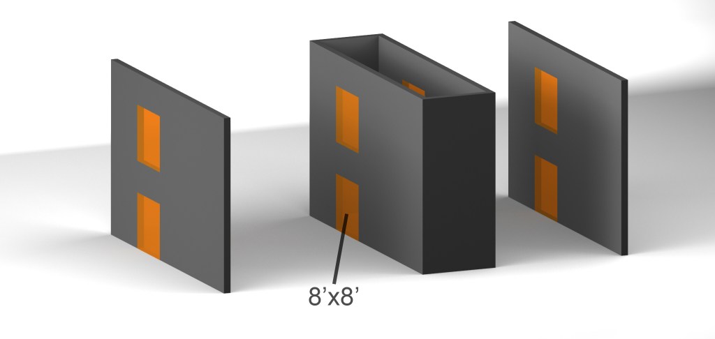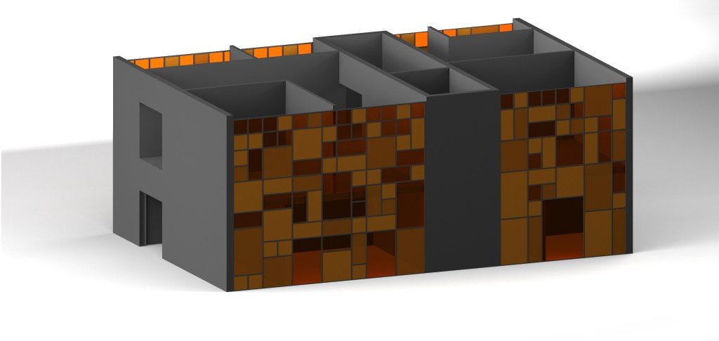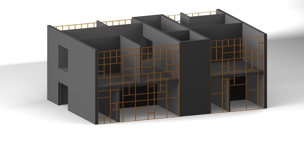 Another iteration of the design used the same material approach, but did so by proposing a generalized approach to retrofitting row houses. First, the bearing walls of the row house are strengthened and reconfigured into an adaptable new format that will withstand the strength of storms. Next, the interior partitions are constructed. Finally, the facade is built using a grid of clear glass, frosted glass, and metal panel. The exact arrangement of the panels is left to the individuals conducting the retrofit.